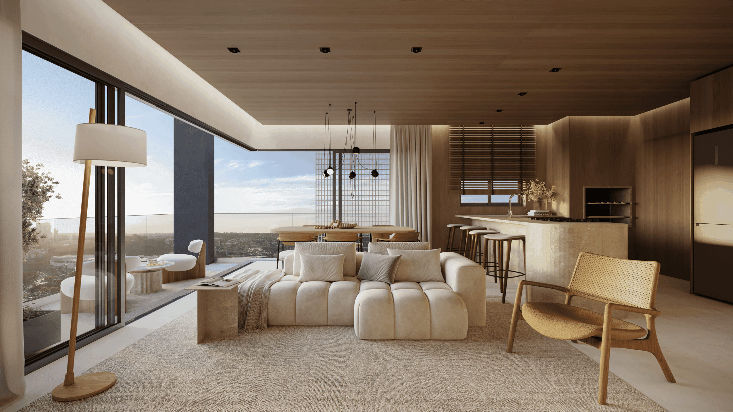 - Viva uma experiência única de bem-estar com esquadrias do piso ao teto em todos os ambientes, que ampliam a luminosidade natural e a sensação de amplitude.